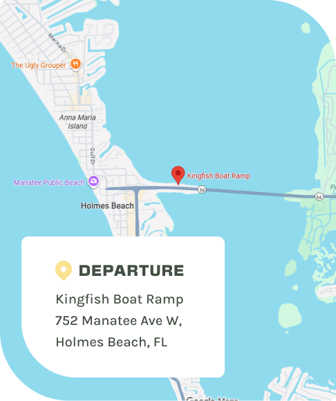 All charters and cruises leave from the Kingfish Boat Ramp, located at: 752 Manatee Ave W, Holmes Beach, FL